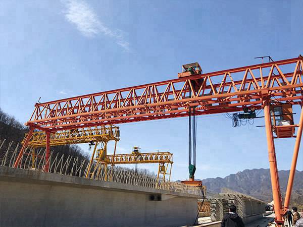 4、起吊拼接好的主梁(主梁有一片也有兩片的,用戶要求來定)兩邊同時起吊,放在豎立的支腿上,然后工人快速爬上去,擰緊螺絲,再把小車吊到主梁上,剛結構部分的安裝就一切OK了。主要運動于公路:制梁場吊模版,吊梁,架梁。
